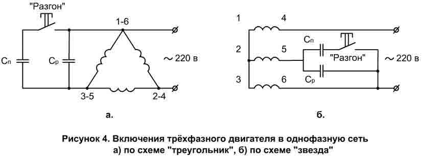 На практике часто приходится подключать трёхфазный двигатель к сети 220 вольт. Хотя КПД при этом падает до 50 % (в лучшем случае до 70%), такая переделка бывает оправданной. Фактически мотор начинает работать как двухфазный. Делается это по схеме звезда или треугольник с применением рабочего и пускового конденсатора, служащих для сдвига фазы и разгона (рисунок 4). Кнопку разгона нужно удерживать до максимальной раскрутки вала, после чего отпустить.Рассчитываются конденсаторы по формулам.