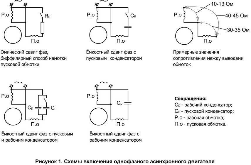 Если в однофазных электромоторах разместить только одну обмотку (по числу фаз), то поле внутри статора будет не вращающимся, а пульсирующим, и пуска или толчка не произойдет, если не раскрутить вал рукой. Чтобы вращение происходило без ручного вмешательства, была добавлена вспомогательная – пусковая обмотка. Она является второй фазой, сдвинутой на 90 градусов, толкающей ротор в момент включения, но, так как мотор включается в однофазную сеть, он всё же называется однофазным. Теперь однофазные асинхронные электромоторы имеют две обмотки – рабочую и пусковую. Пусковая обмотка включается на короткое время лишь для запуска вала (не больше чем на 3 секунды). Рабочая включена постоянно. Определить выводы обмоток можно с помощью тестера. На рисунке показано соотношение между обмотками и общим выводом. Чтобы запустить мотор нужно подать 220 вольт на обе обмотки и после набора оборотов сразу отключить пусковую. Для сдвига фазы используют омические сопротивления, конденсаторы и индуктивности. Причем сопротивление может быть не в виде отдельного резистора, а частью пусковой обмотки, намотанной по бифилярной технологии, когда индуктивность катушки остаётся такой же, а её сопротивление увеличивается за счёт большей длины медного провода. Схема подключения однофазного электродвигателя показана на рисунке 1.
