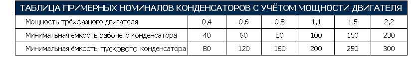 Сложность в том, что под нагрузкой и при холостом ходе ток через обмотки течёт разный, а значит, ёмкость нужно будет подбирать экспериментально, под конкретную нагрузку. Если ёмкость будет больше, чем нужно мотор будет перегреваться. Для приблизительного определения номиналов, исходя из мощности электромотора, служит эта таблица.
