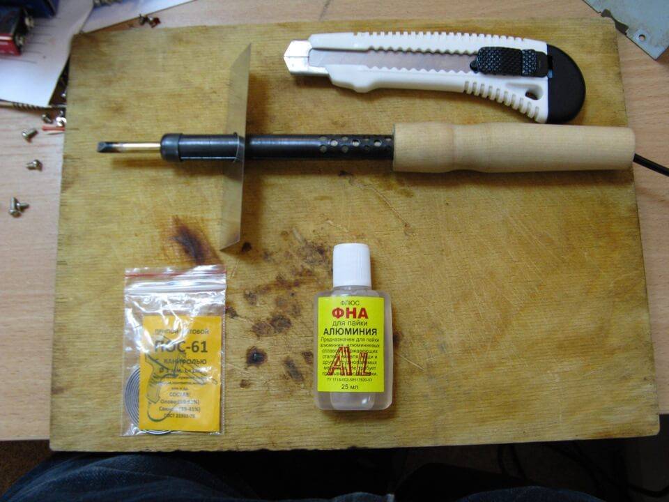 Для спаивания проводов понадобится паяльник, припой и флюс. Выполнять работы лучше на деревянной подставке. Для паяльника нужно заранее подготовить подставку, чтоб горячее жало не повредила поверхность стола.