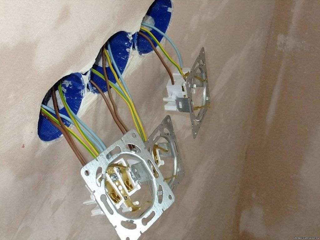 Сборное изделие установить сложнее. Для монтажа нужен проводник той же длины, что и подключенный к основному подрозетнику. Это значит, что для сети с тремя проводниками (2 питания и земля) требуется три дополнительных кабеля. Дополнительные протягиваются между подрозетниками. В том, в котором есть вывод основного электропровода, к зажимам подключаются пары кабелей (основной и вспомогательный). Во втором подрозетнике все подключается стандартно.