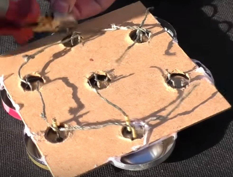 Теперь нужно проделать отверстия в ДВП. Оно должно совпадать с параметрами транзистора. Размер деревянного прямоугольника должен быть таким чтобы вошло 7 донышек банок.