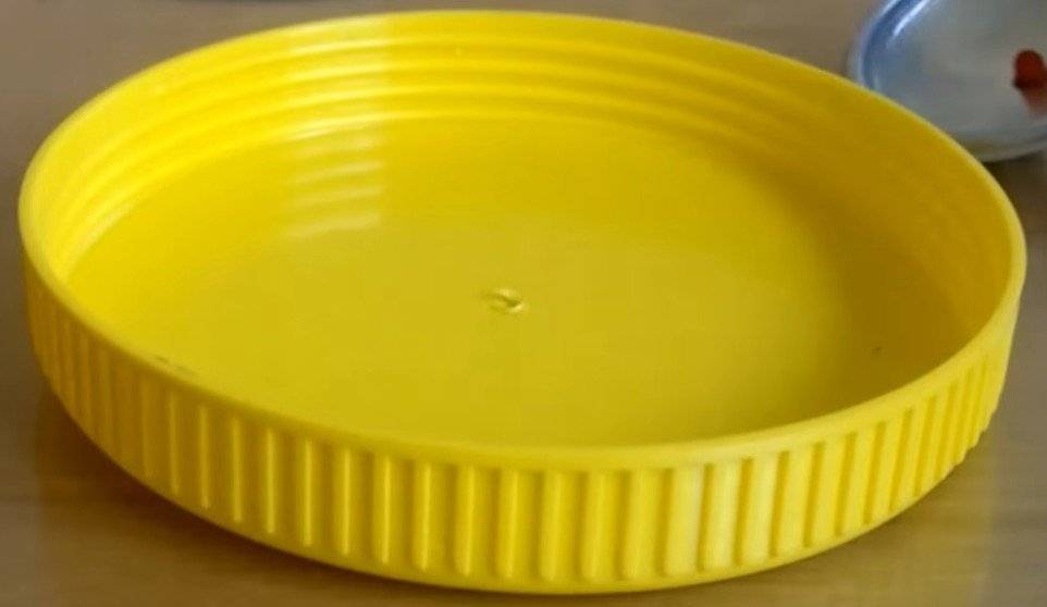 Первым делом выполняем работу с крышкой. В ней нужно проколоть отверстие. Это можно сделать аккуратно ножницами, гвоздем или шилом.
