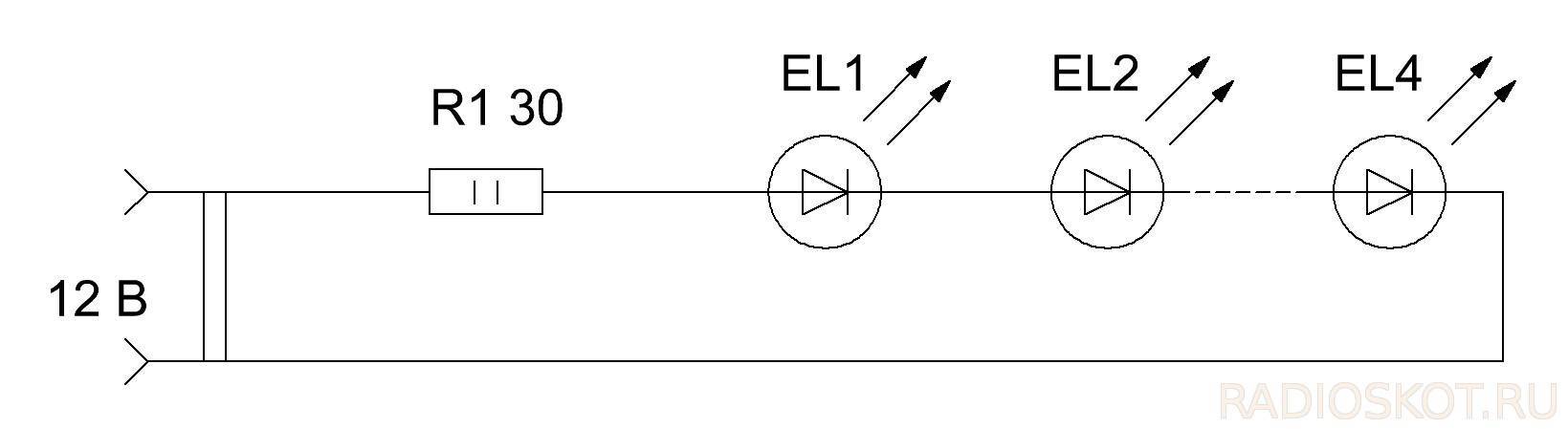 В качестве тестовой нагрузки использована самодельная светодиодная фитолампа на 4-х последовательно включенных фитосветодиода мощностью 1 Вт, последовательно со светодиодами включен резистор типа МЛТ-2, сопротивлением 30 Ом. При напряжении 12,6 В, ток потребляемый лампой составит около 60 мА. Таким образом аккумулятор на 1,2 А*ч позволяет питать эту лампу около 20 часов.