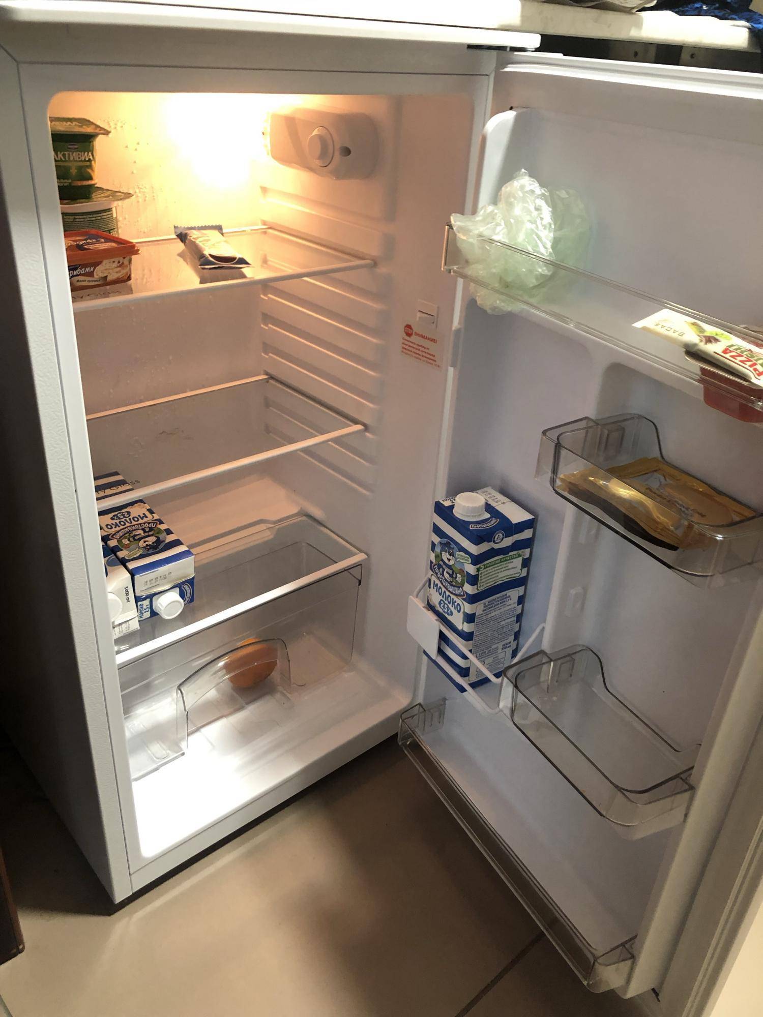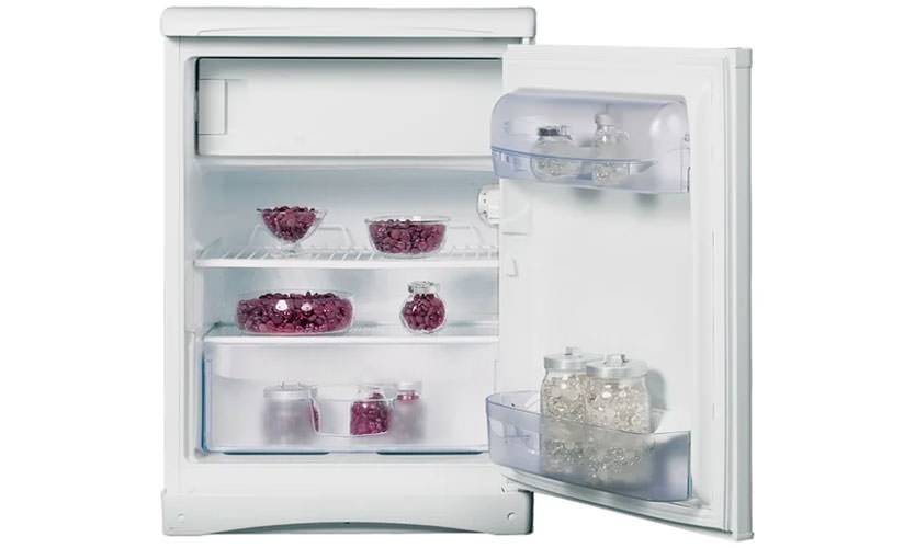 Indesit TT 85 — холодильник европейского производства. Объём — 120 литров (106+14). Габариты — 85x62x60 см. Управление механическое, система разморозки — капельная. Сравнивая его с Бирюсой 108, отмечу большую ширину и вдвое меньший объём морозилки. Для однокамерных холодильников это некритично: на долгое хранение и глубокую заморозку продуктов они не рассчитаны. Цена TT 85 — почти 12 тысяч.