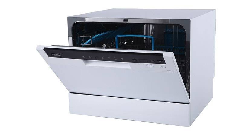 Настольная ПММ — оптимальный вариант для малогабаритной кухни, семьи из двух-трёх человек и холостяков. Приспособление, размером с микроволновку размещается на любой свободной поверхности. А в случае ненадобности быстро может быть отключено и убрано.