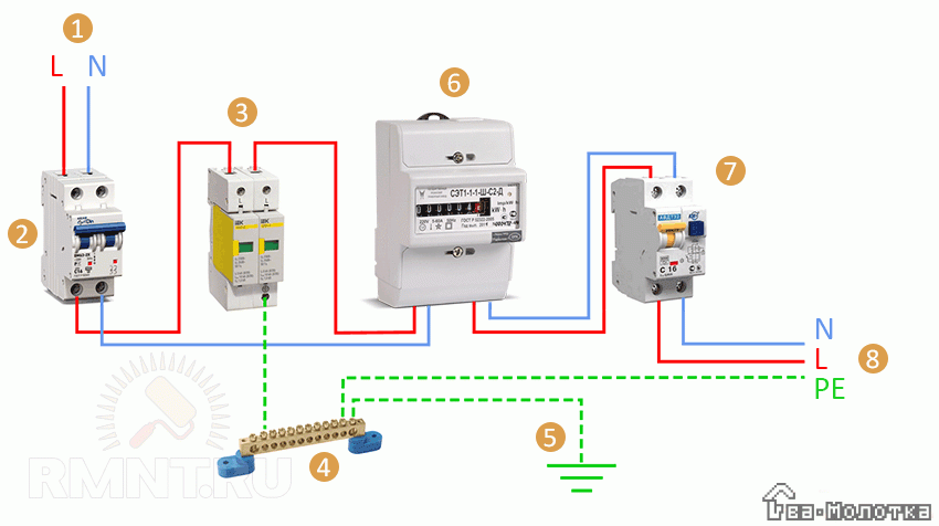 Пример подключения УЗИП: 1 — ввод; 2 — автоматический выключатель; 3 — УЗИП; 4 — шина заземления; 5 — контур заземления; 6 — счетчик электроэнергии; 7 — дифференциальный автомат; 8 — к автоматам потребителей