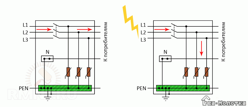 Как и в предыдущем случае, уменьшенный импульс молнии разойдется на контур земли и PEN проводник.
