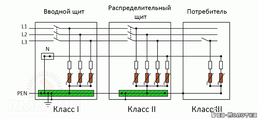 По месту установки устройства импульсной защиты от повышенного напряжения делят на 3 класса: I (B), II (C), III (D).