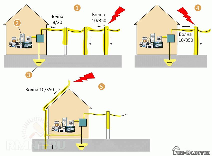 1 — удаленный удар молнии в ЛЭП; 2 — потребители; 3 — контур заземления; 4 — близкий удар молнии в ЛЭП; 5 — прямой удар молнии в громоотвод