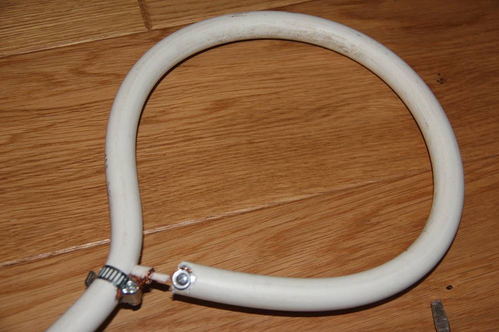 Оставшийся 1 см пойдёт на скрепляющие петли. Концы рамки необходимо припаять. Далее зачищаем один конец кабеля и припаиваем его к центру рамки таким образом, чтобы стержень и экран не соприкасались.