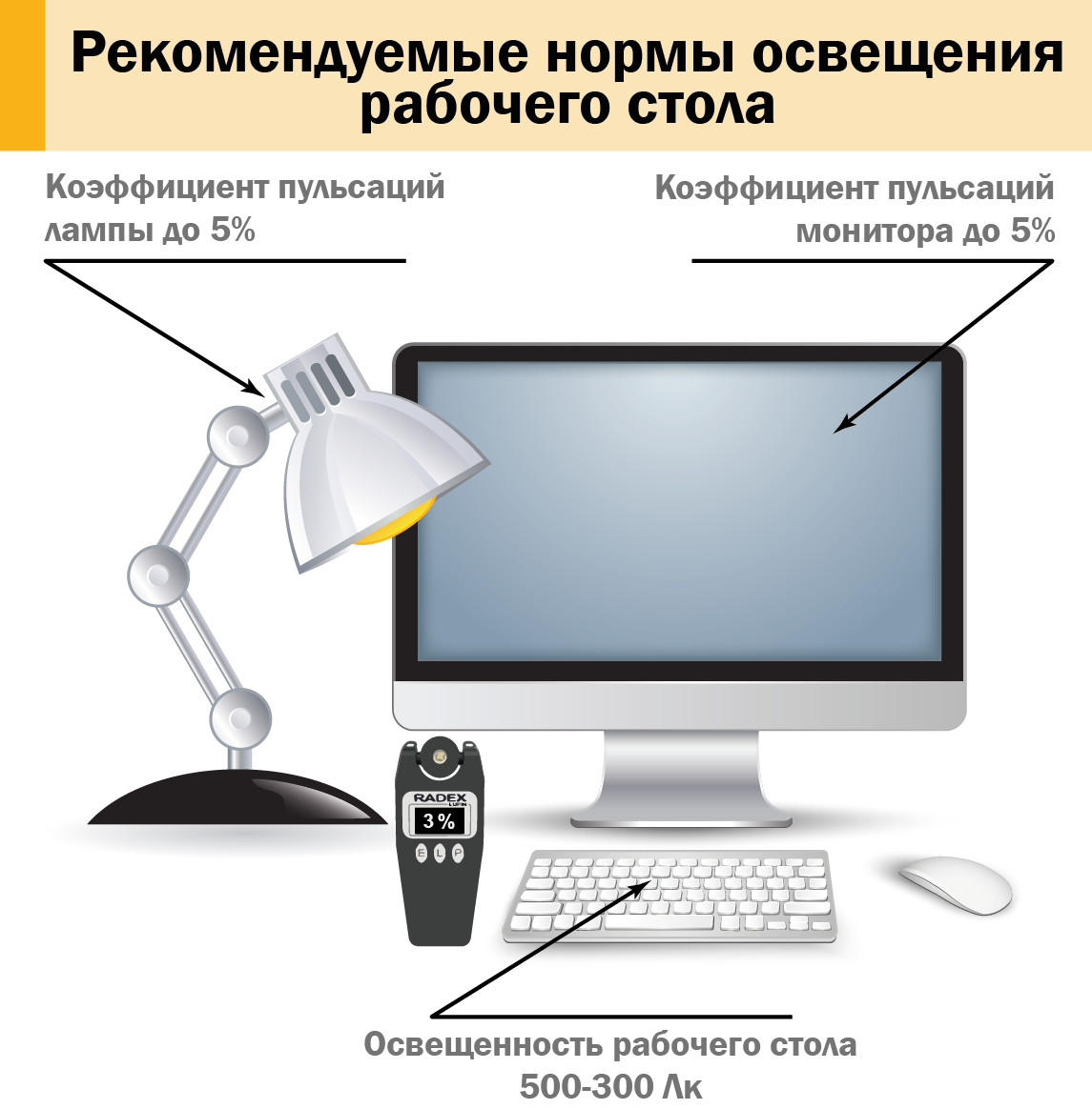 Лучше ориентироваться не на этот примерный показатель, а на реальную освещенность стола лампой, которую легко проверить с помощью люксметра-яркомера-пульсметра RADEX LUPIN. Освещенность рабочей зоны детской должна составлять не менее 300-500 лк. Этот же измерительный прибор покажет коэффициент пульсации света, максимально допустимое значение которого – 10 %, при работе с компьютером – 5 %.
