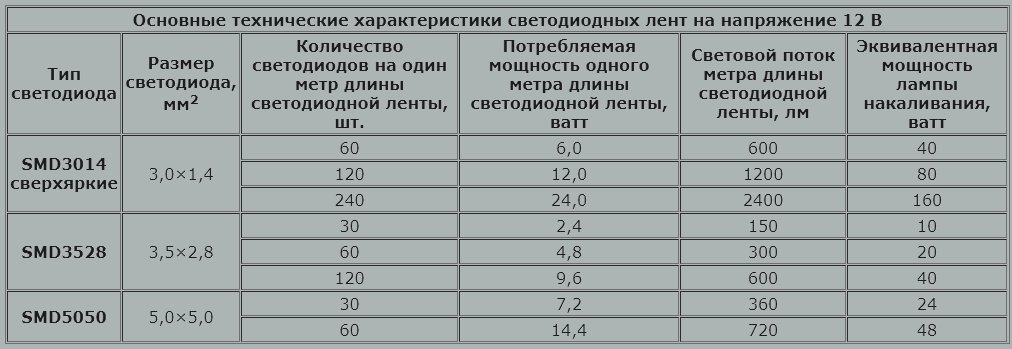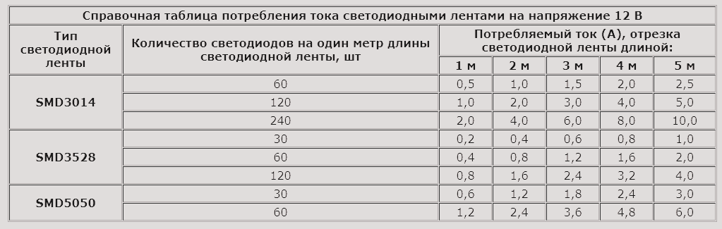 Так, к примеру, каждые три светодиода размером 3528 потребляют 0,24 Вт (ток 20 мА), каждые три диода 5050 – 0,72 Вт (ток 60 мА). Довольно умножить эти значения на количество триад на ленте. Еще проще – просто пользоваться таблицей, где указана мощность 1 метра самых распространённых типов лент.