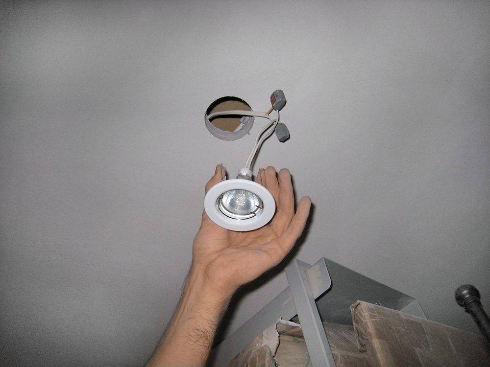 Обратите внимание, чтобы провода питающие светильник не попали под зацепы. После вставки светильника зацепы самостоятельно прижимают его к потолку и надежно удерживают его там