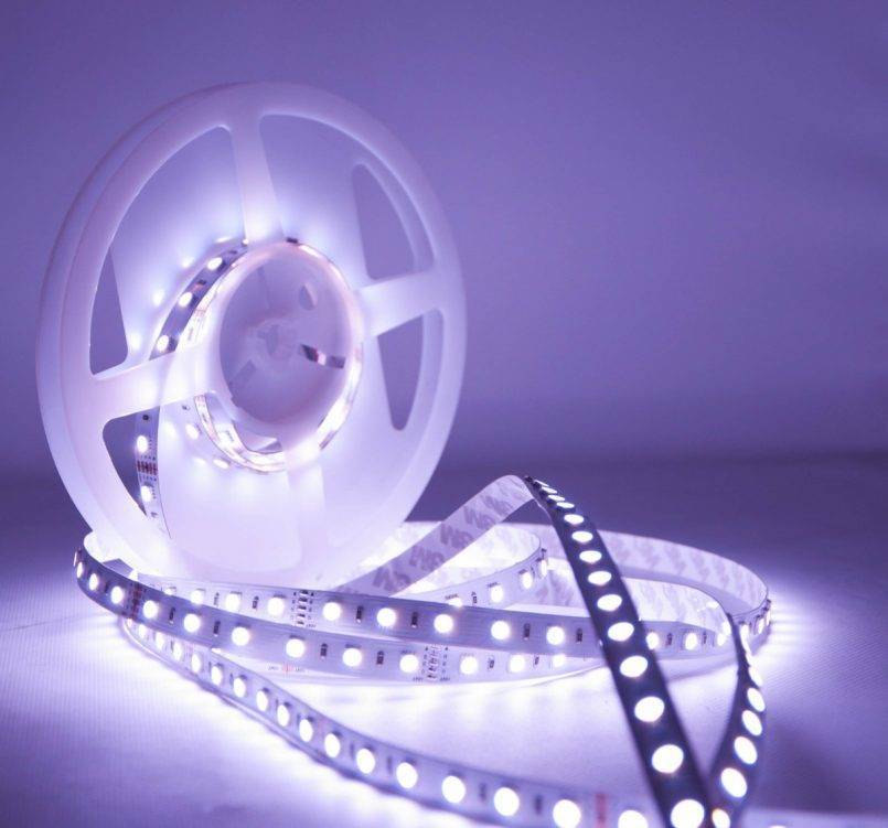 Светодиоды собраны в пакеты по 5–10 штук, которые отделены друг от друга группами контактов. В этих местах ленту можно разрезать и подключить отрезанную часть к питанию как самостоятельную единицу или соединить с другой, если ее длина показалась недостаточной. Обычная длина светящейся ленты в заводской упаковке равна пяти метрам. Для удобства монтажа на ее тыльной стороне нанесен слой клея, защищенный снимающейся пленкой.