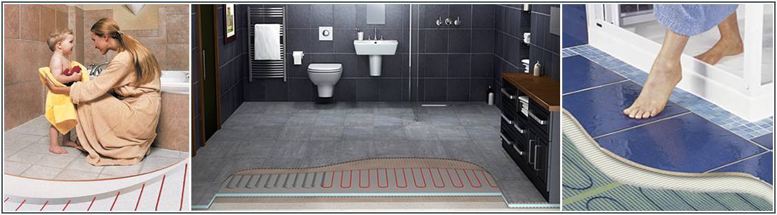 - Теплый пол в ванной под ванну, унитаз, стиральную машину, душевой кабинкой с поддоном не стелим. Если кабель попадает под стационарную мебель, происходит запирание тепла, что сокращает рабочий ресурс системы.