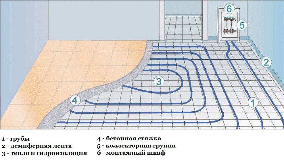 Схема такого пола на картинке выглядит всегда довольно сложной – масса коммуникаций, соединенных между собой, по которым к тому же течет вода. Однако на деле система включает не такой уж обширный список элементов.