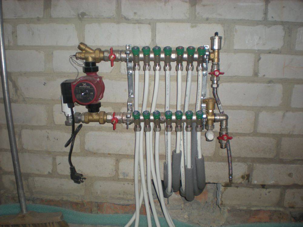 Далее вода начинает распределяться по контуру обогрева при помощи – системы разветвления труб. Также она называется коллектором. Представляет собой она две трубы – подачу и «обратку», — которые подают и собирают воду с ветвей системы.