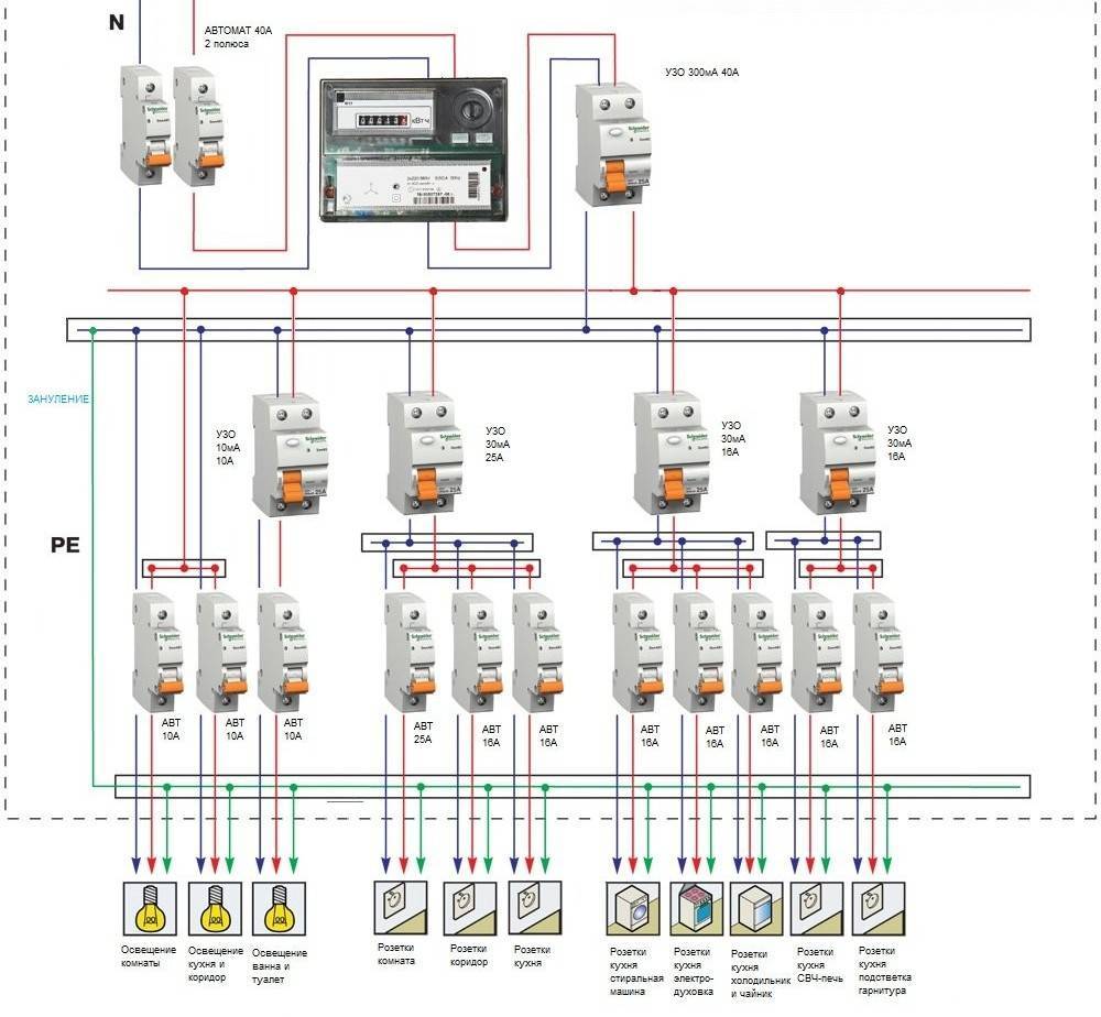 В соответствии с ПУЭ на каждом участке электрической сети должно устанавливаться УЗО и электрические автоматы, которые должны быть рассчитаны на соответствующую нагрузку. Ток можно рассчитать, воспользовавшись формулой I=P/U•cos, где I- сила тока, P – мощность нагрузки, которая подключена к конкретному участку сети, U – напряжение электрической сети, cos – постоянный коэффициент, который принимают равным 1.