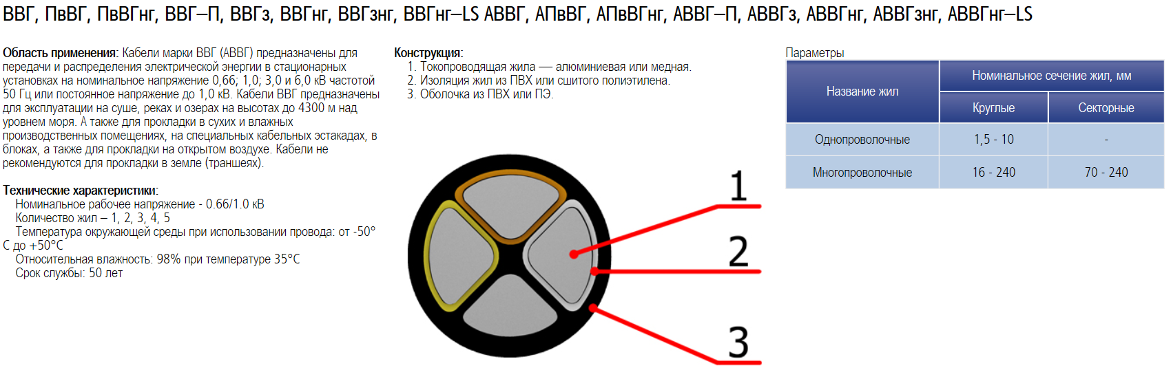 Итак, мы подошли к самой важной части статьи – описанию технических характеристик и условий эксплуатации кабеля АВВГ. Среди основных параметров, которые Вам могут понадобиться для электромонтажных работ, выделяют: