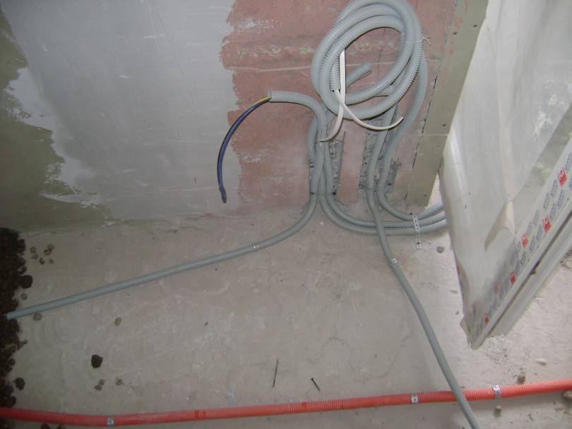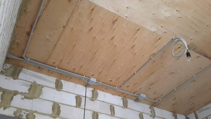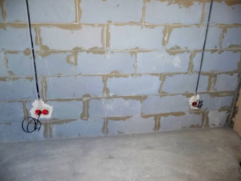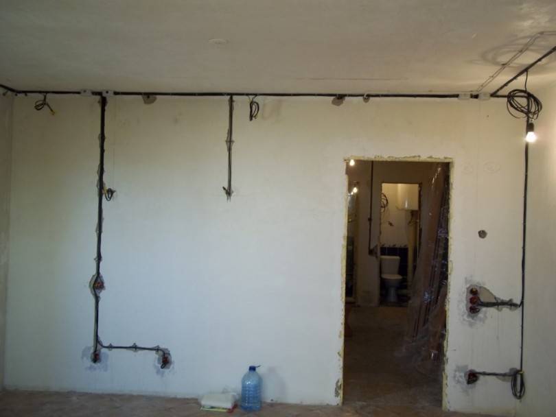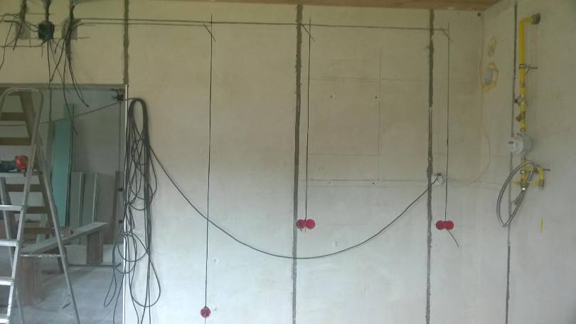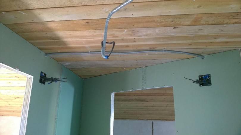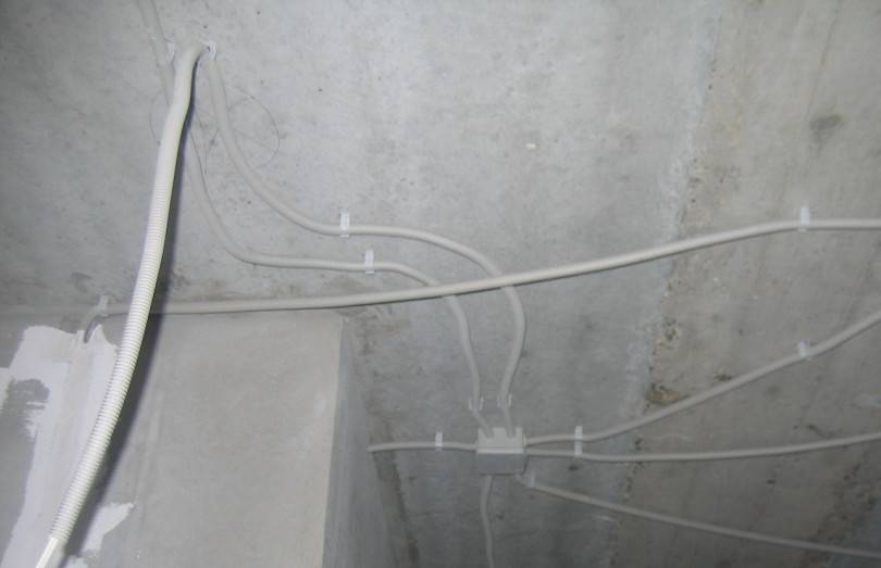 Перед окончательной обшивкой стен и труб необходимо организовать вывод наружу всех нужных кабелей. В заранее определённых местах подготавливаются отверстия для выключателей, розеток и распределительных коробок. Отдельное отверстие требуется под распределительный щит.