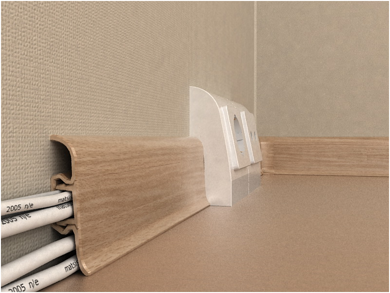 - Прокладки кабеля под плинтусом — небольшое пространство и соприкосновения кабеля с деревянным или пластиковым плинтусом может стать причиной его перегрева. Кабель можно прокладывать под плинтусом, но это должна быть специальная конструкция с зазорами в 10–15 мм.