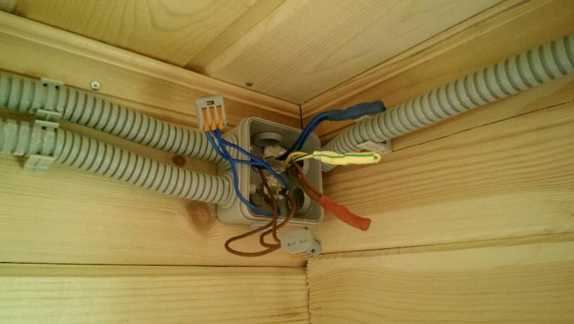 После обшивки стен и подготовки требуемых отверстий устанавливаются все коробки и розетки. В большинстве случаев применяются устройства накладного исполнения: сверлить все дыры в сплошной древесной стене опасно с точки зрения пожарной безопасности.
