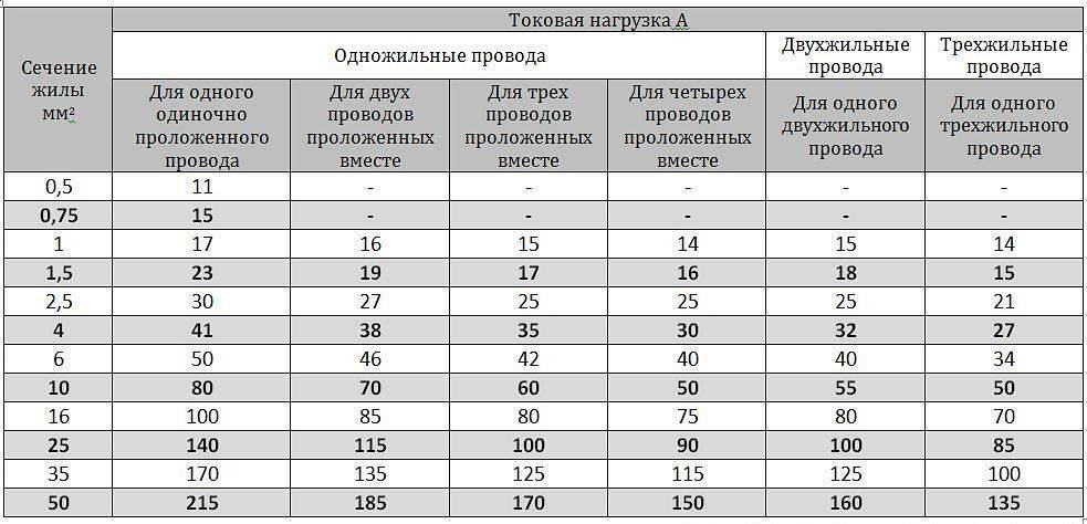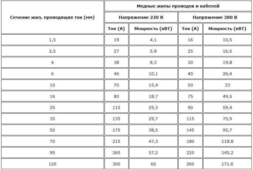Таблица зависимости мощности от сечения провода