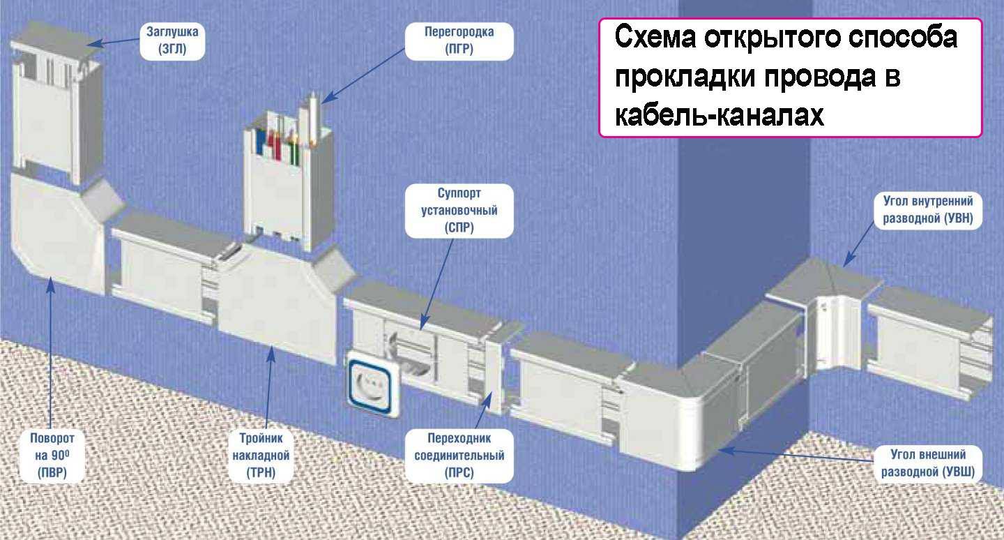 Основных способов монтажа электропроводки, по сути, только 2: открытый, также называемый наружным или внешний, и закрытый — внутренний. Первый способ монтажа проще — он предусматривает прокладку кабелей снаружи стен, в кабель-каналах.