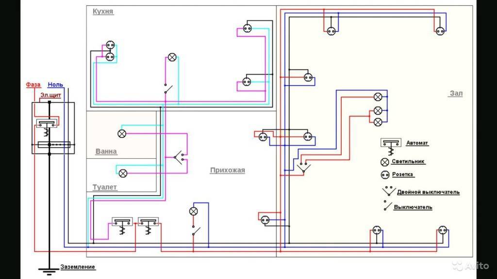 Электрическая схема квартиры отличается от предыдущей по количеству контуров. Двухкомнатный тип жилья чаще всего компонуют: