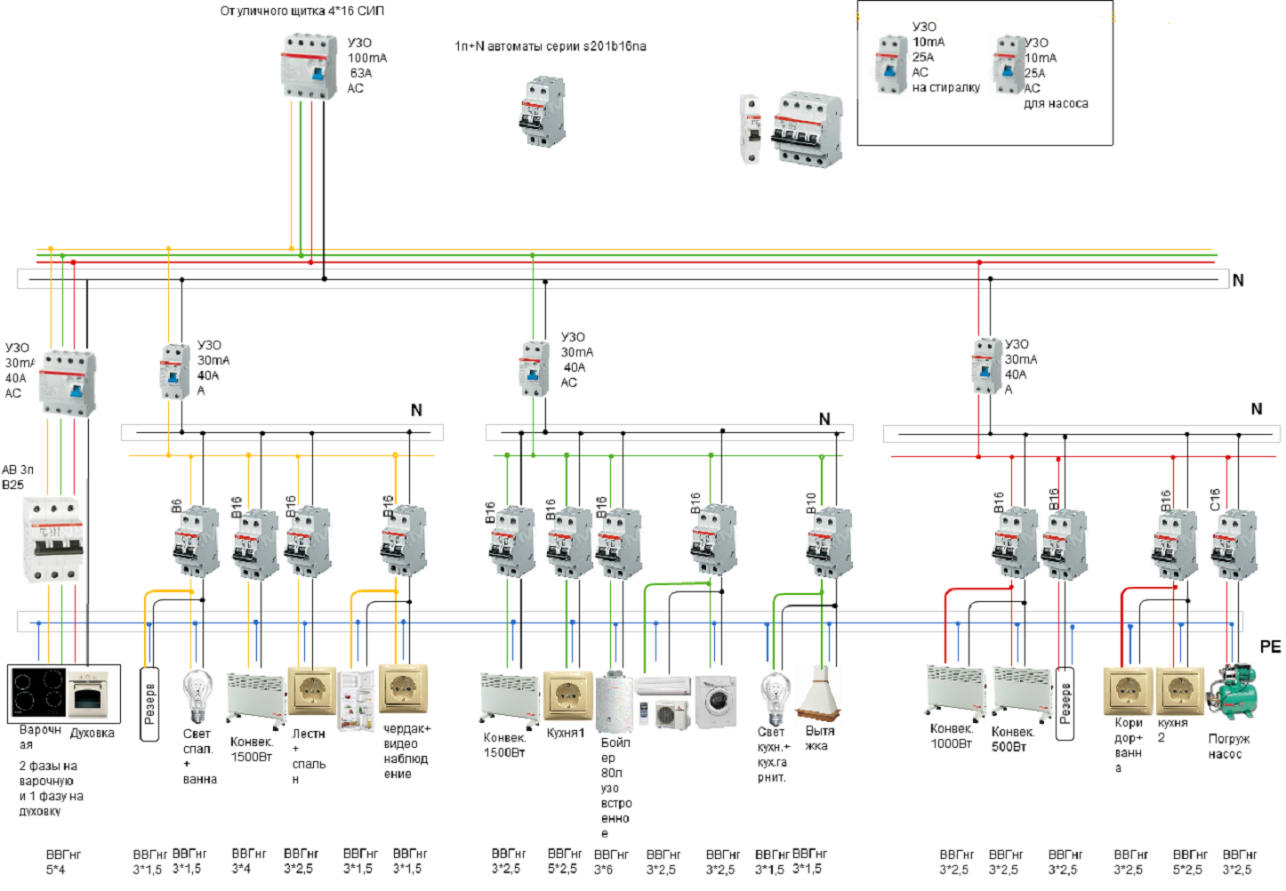 - защитные автоматы на 10 А подключаются на освещение, на 16 А – к розеткам, на 25 А – к мощной бытовой технике;