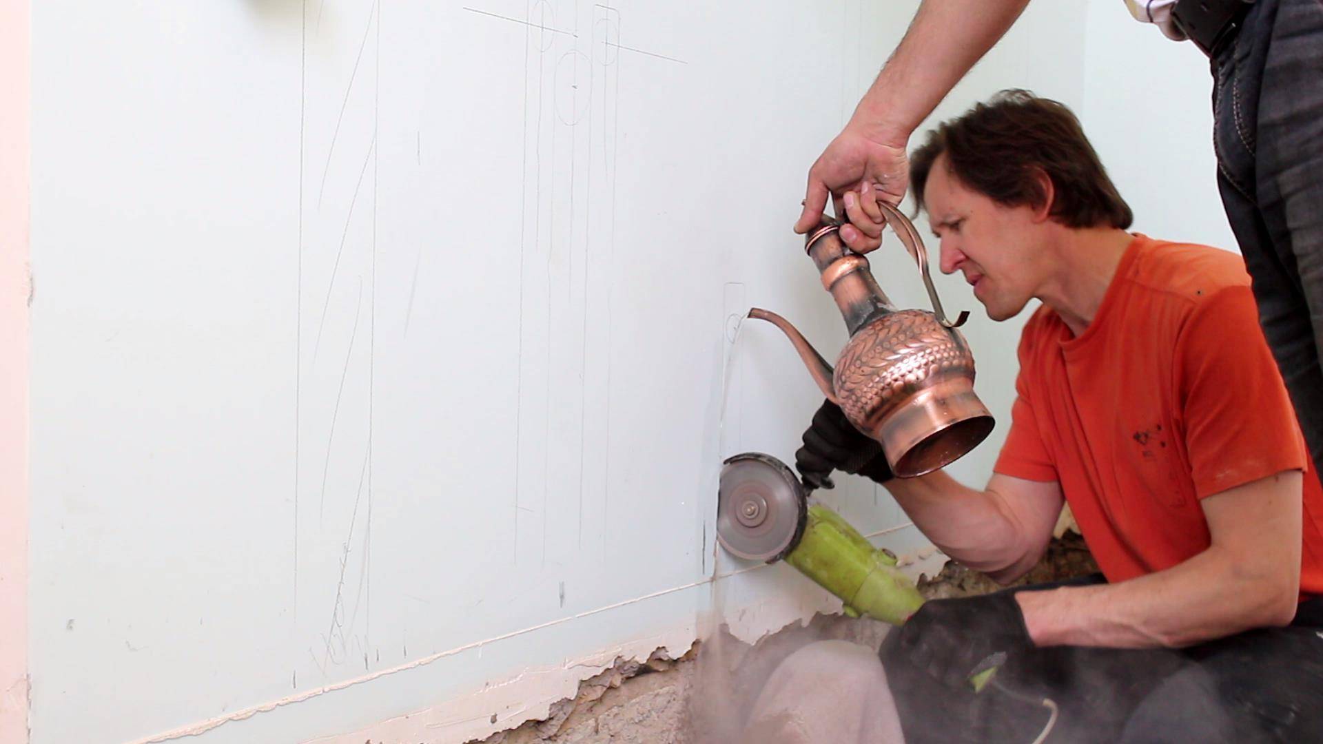 - Во время изготовления штробы использовать воду для смачивания места резки. Вода может подаваться по шлангу или при помощи напарника, который будет лить ее из любой тары.
