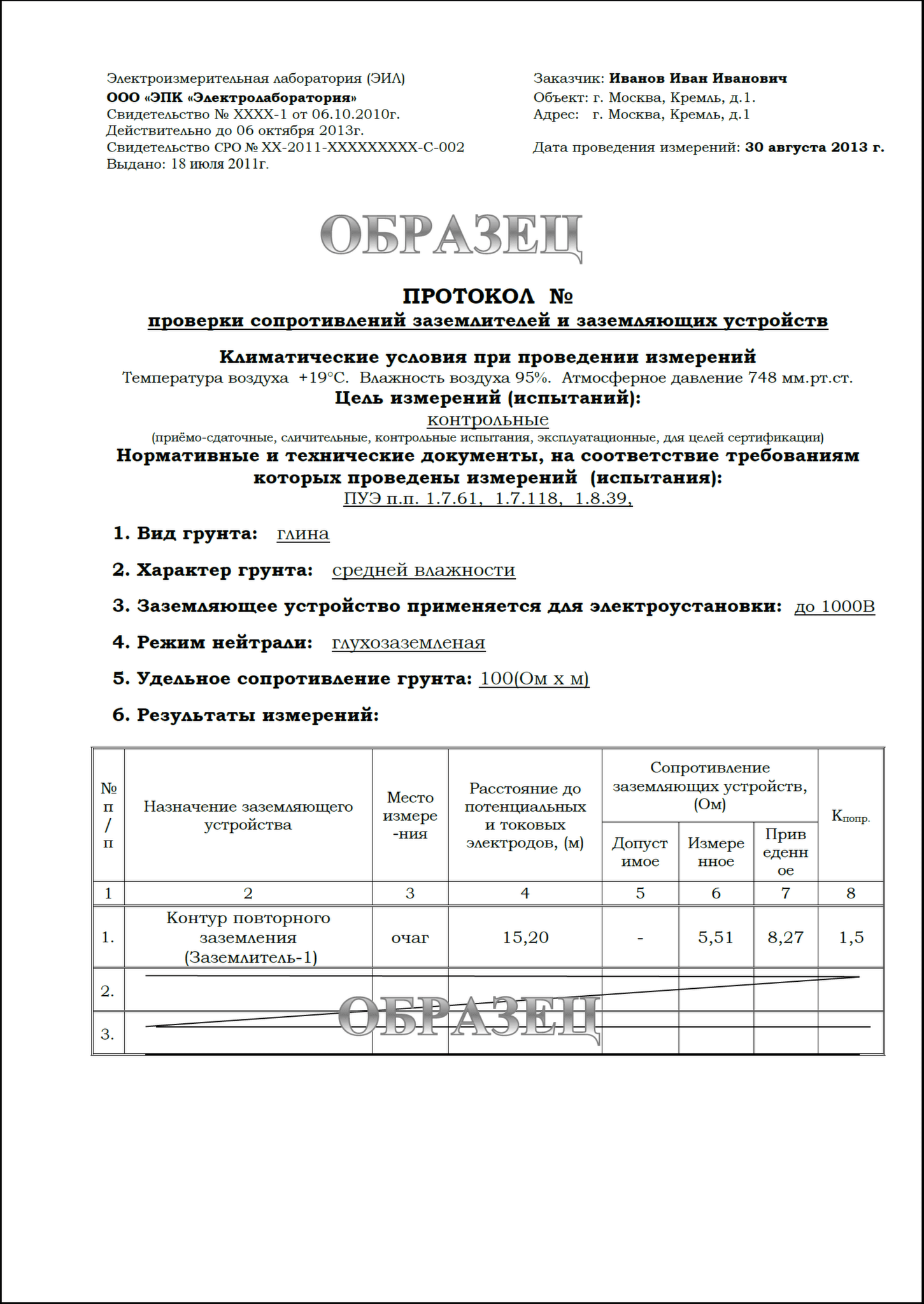 Если вы хотите, чтобы измерения защитного и рабочего заземления проводили специалисты, то необходимо обратиться в специальную электротехническую лабораторию. По окончании работы вам будет выдан протокол измерения сопротивления заземления. В нем отображается место проведения работ, назначение заземлителя, сезонный поправочный коэффициент, а также на каком расстоянии друг от друга находятся электроды. Образец протокола предоставлен ниже:
