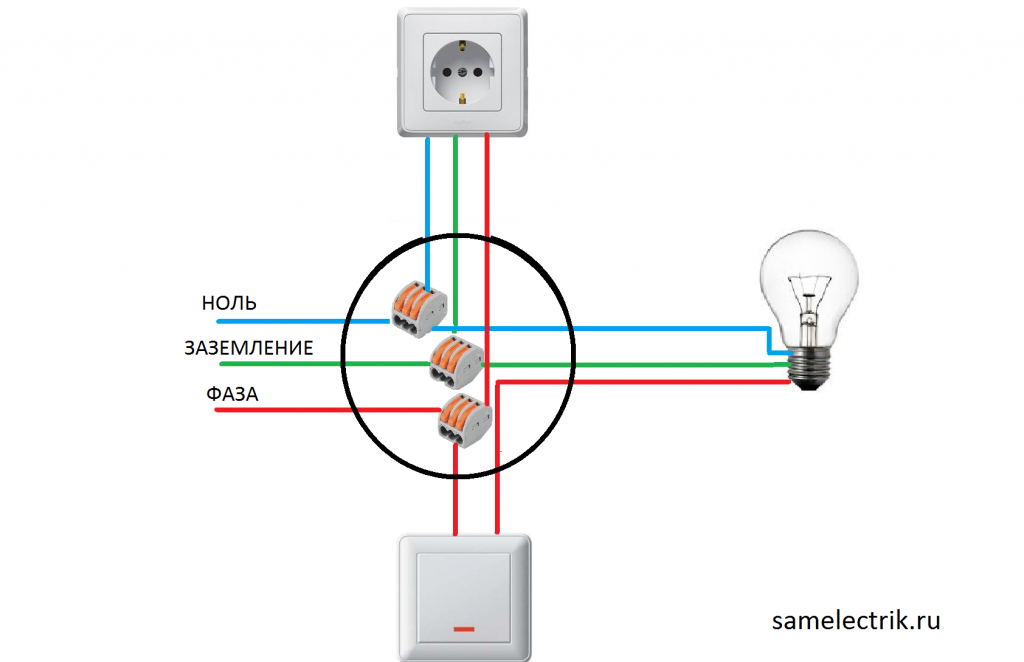 Как видим из схемы для подключения розетки с выключателем, нам требуется три провода: по одному приходит фаза, по-другому ноль, а по третьему через перемычку на вход выключателя фаза возвращается запитывая лампочку светильника.