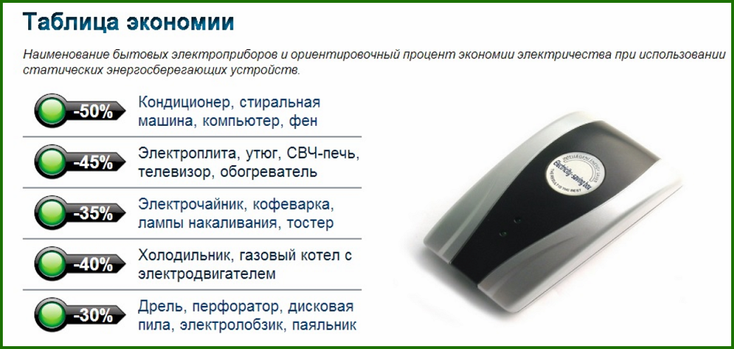 Производители приборов обещают 30-процентное сбережение энергии. Некоторые считают это утверждение мифом. Вполне возможно, причиной неудовлетворительных отзывов об устройстве можно считать покупку экономителя от китайских производителей. В таких приборах устанавливаются низкомощные конденсаторы.