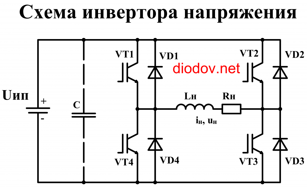 В один момент времени открывается пара транзисторов VT1 и VT3. Создается путь для протекания тока от аккумулятора GB через активно-индуктивную нагрузку RнLн. В следующий момент VT1 и VT3 заперты, а открыты диагонально противоположные транзисторы VT2 и VT4. Теперь тока протекает от аккумулятора через RнLн в противоположном направлении. Таким образом, ток на нагрузке изменяет свое направление, поэтому является переменным. Как видно, ток на нагрузке не является синусоидальным. Поэтому применяют ШИМ для получения синусоидально формы тока.