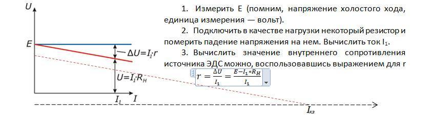 Померить внутреннее сопротивление источника ЭДС, казалось бы, можно. Стоит включить в цепь амперметр и шунтировать (закоротить) внешнее сопротивление. Однако внутреннее сопротивление настолько низко, что аккумулятор начнет разряжаться катастрофически, вырабатывая огромное количество теплоты, как на внешних закороченных проводниках, так и во внутреннем пространстве источника.