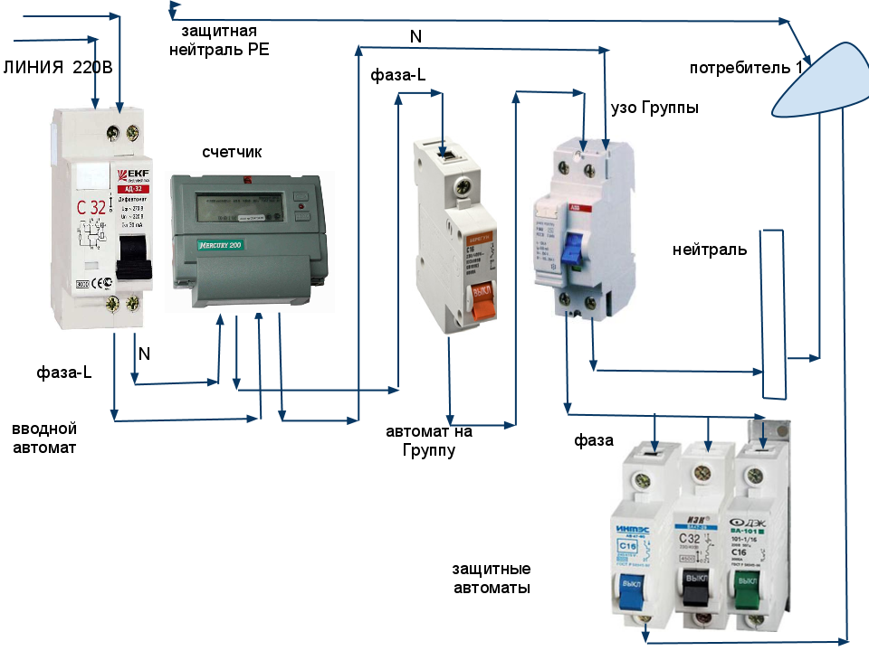 Корпус электрического щитка монтируется в том месте, где он отображен на схеме. Подключение осуществляется следующим образом: