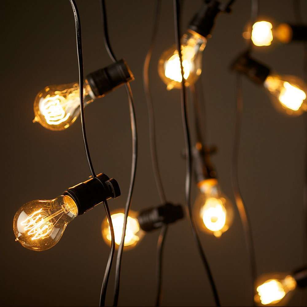 В зависимости от предпочтений и общего цветового фона можно выбрать различные варианты проводов. Это могут быть свободно висящие декоративные шнуры, затянутые в большой декоративный узел или собранные в пучок. Выбор тех или иных ламп также зависит от типа освещения. Для настенных бра можно выбрать лампы, имитирующие огонь свечи. Для размещения над кроватью или креслом подойдут большие лампочки с круглой колбой. С помощью них также можно организовать и центральное освещение комнаты. Для этого вместо люстры подвешиваются сразу несколько ламп на длинном шнуре, собранном в пучок. Оригинально разнообразить интерьер поможет ретро гирлянда с лампами накаливания. Также она подойдет для украшения торжественного мероприятия, например, свадьбы. Уместна она будет и на праздновании Нового года. Ее теплый янтарный цвет создаст атмосферу волшебства и праздника. Гирлянда из ретро ламп – это эффектный вариант декоративного оформления, который идеально подойдет для декорирования зала, фасада здания или сада. Беседка, украшенная такой гирляндой, выглядит шикарно и романтично одновременно.