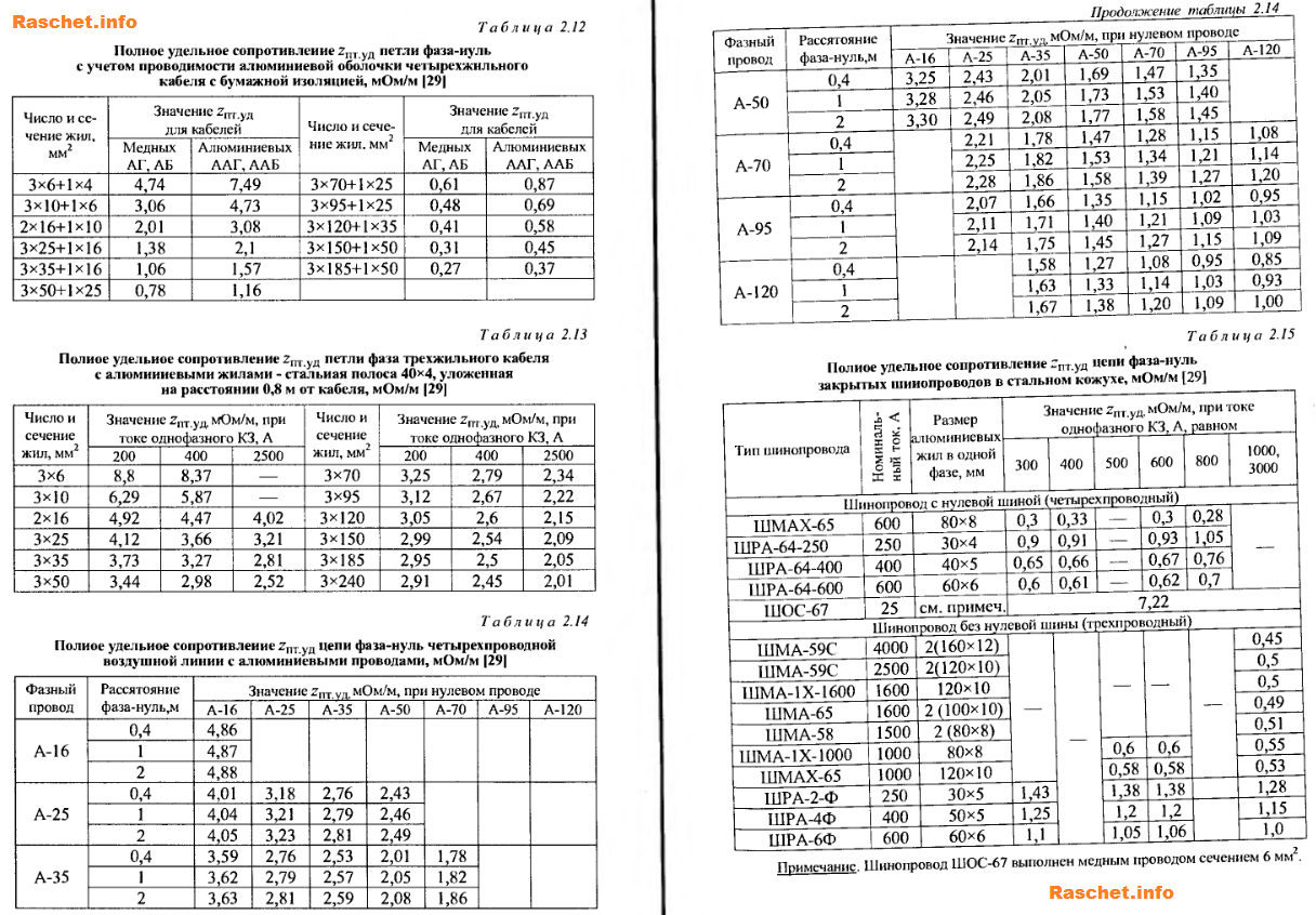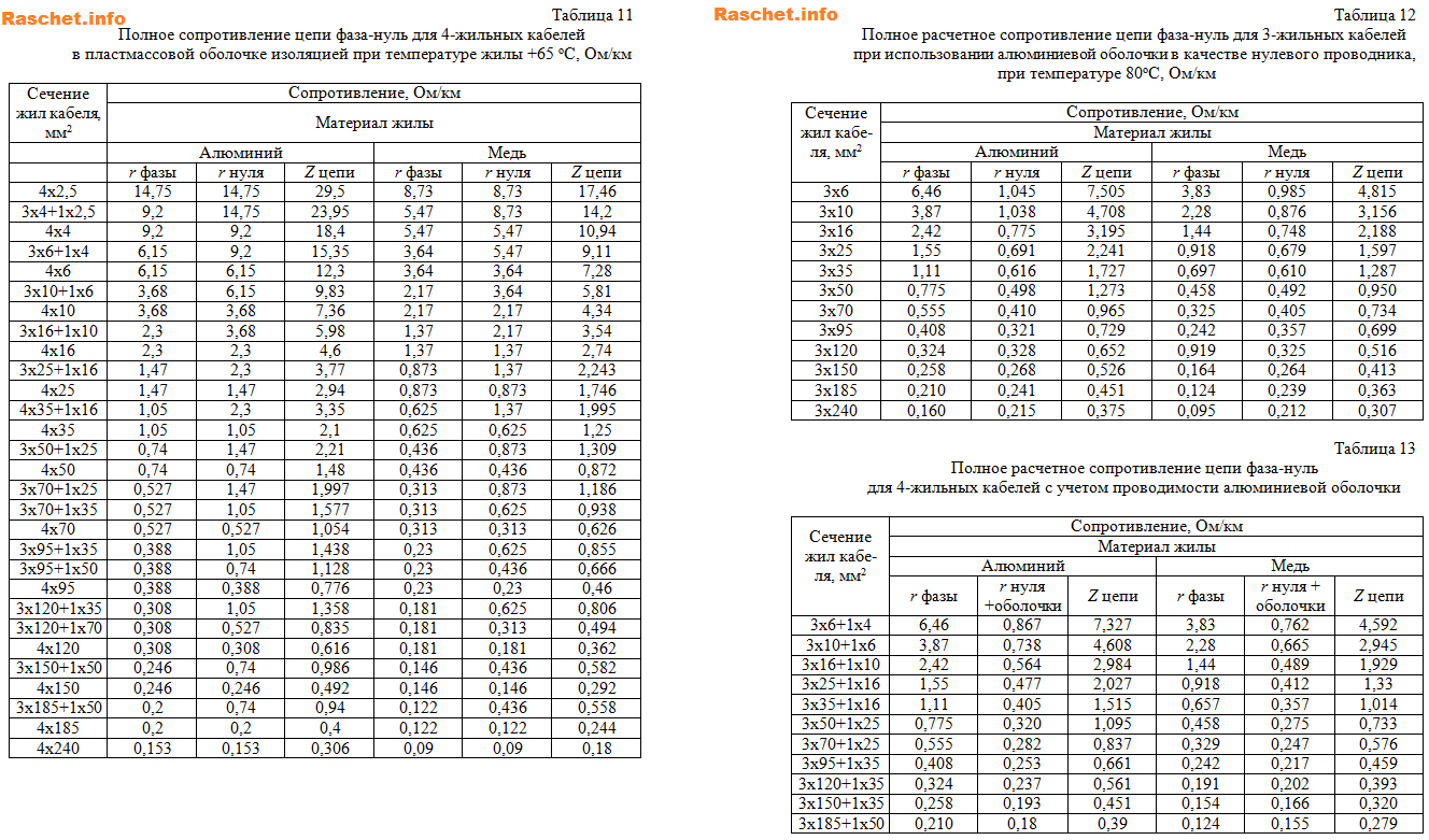 Ниже представлены справочные таблицы со значениями удельного сопротивления петли фаза-нуль для различных кабелей и шинопроводов согласно .