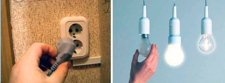 От сети отключаются все приборы. Вилки вынимаются их розеток. Лампочки выкручиваются из патронов светильников