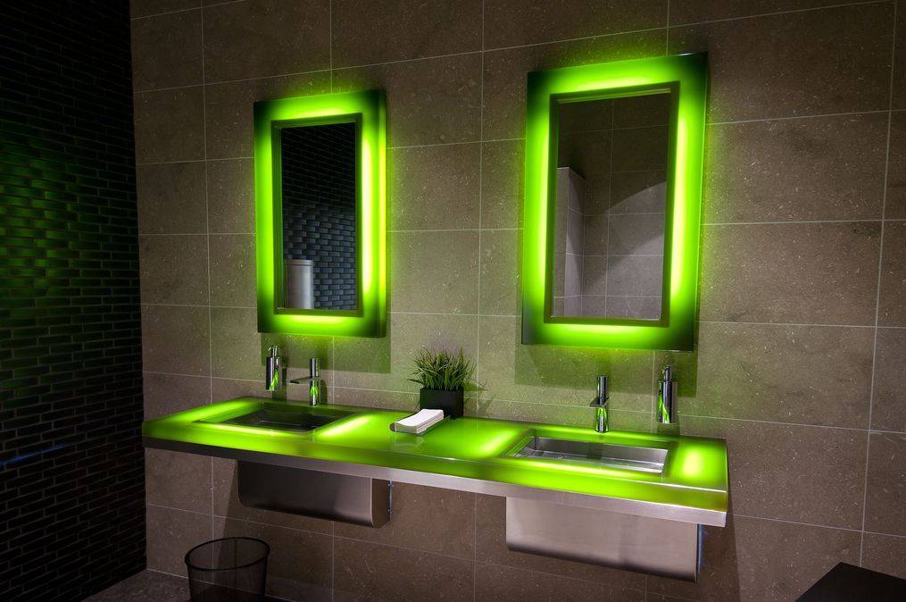 В просторном помещении дизайнерские лампы устанавливаются сверху. В оформлении ванной комнаты используют зеркала с геометрическими фигурами, за которым расположена светодиодная лента. С помощью каленого стекла и диодов можно создать световые рисунки в виде животных, знаков зодиака.