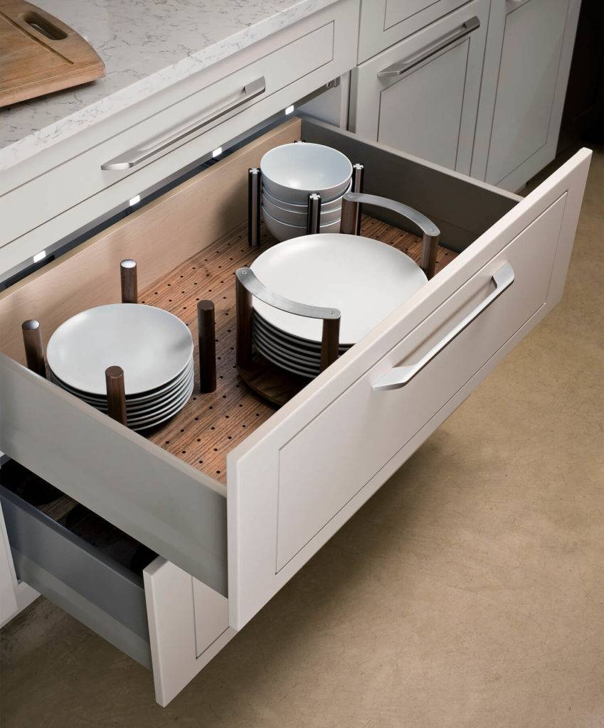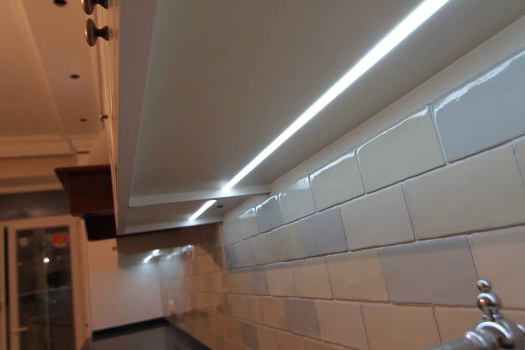 - Врезные светильники для подсветки мебели могут быть установлены в козырек, выступающий карниз на шкафах, а также любые горизонтальные поверхности (днища навесных шкафов и полки). Этот вид подсветки для мебели требует предварительного проектирования – для установки потребуется предусмотреть место для врезки, сделать скрытой «изнанку» с проводами и выключателями. Но и смотрится врезной светильник для подсветки более органично, как неотъемлемая часть мебели.