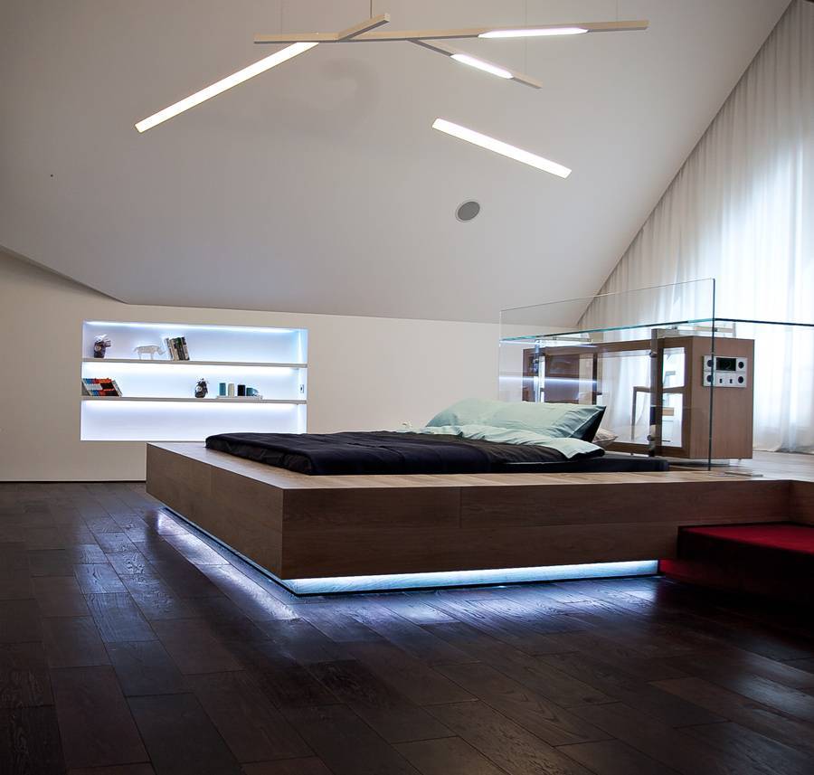 Зачастую в подиуме встраиваются дополнительные ящики для хранения вещей. Здесь обязательно необходимо предусмотреть освещение, которое поможет сохранить порядок и создать комфортные условия для пользователя.