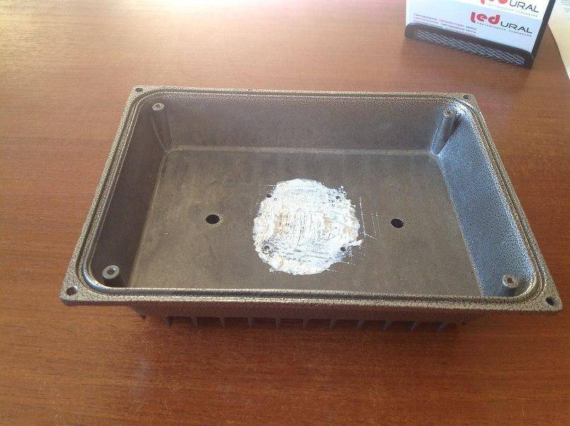 Таким образом, чтобы одна его полка прилегала к внутренней стенке прожектора, а ко второй крепилась плата со светодиодами.