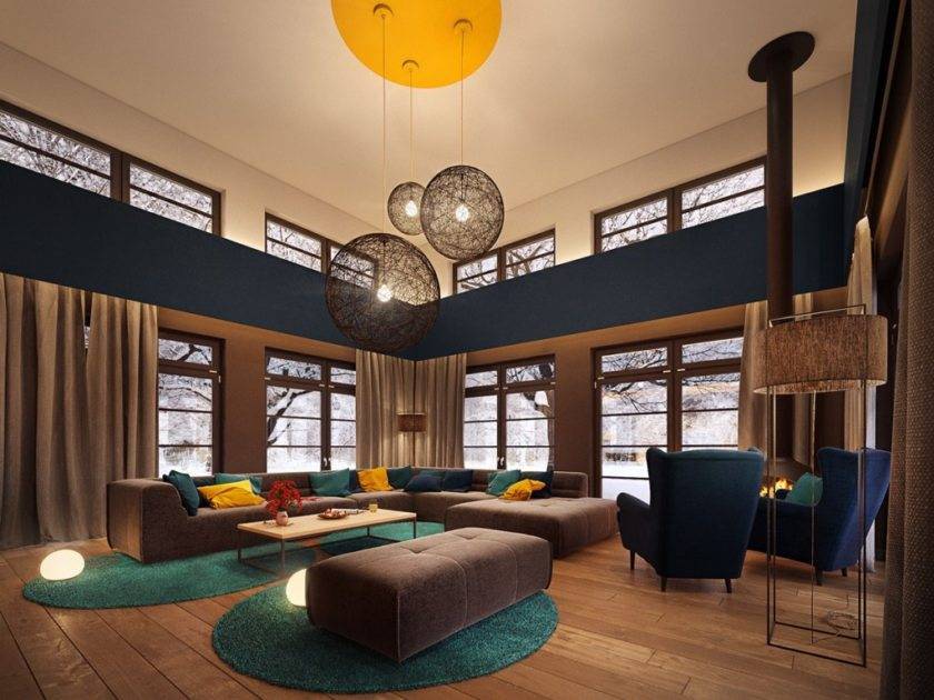 Гостиная — самая большая комната в доме, что подразумевает наличие достаточного количества источников освещения. Если площадь помещения превышает 15-16 кв.м, комнату разделяют на несколько зон, и для каждой подбирают светильники. Это может быть несколько люстр различной формы и размера, но выполнены они должны быть в едином стиле, подходящем к интерьеру зала.