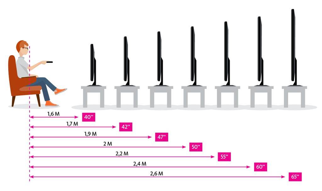 Диагональ выбираемого телевизора напрямую зависит от предполагаемого расстояния между ним и зрителем. Выбор здесь довольно широкий — можно найти модели диагональю от 40 до 105 дюймов.
