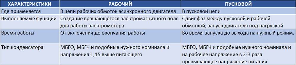 Сравнительная таблица применения конденсаторов для асинхронных двигателей, включенных на напряжение 220 В.