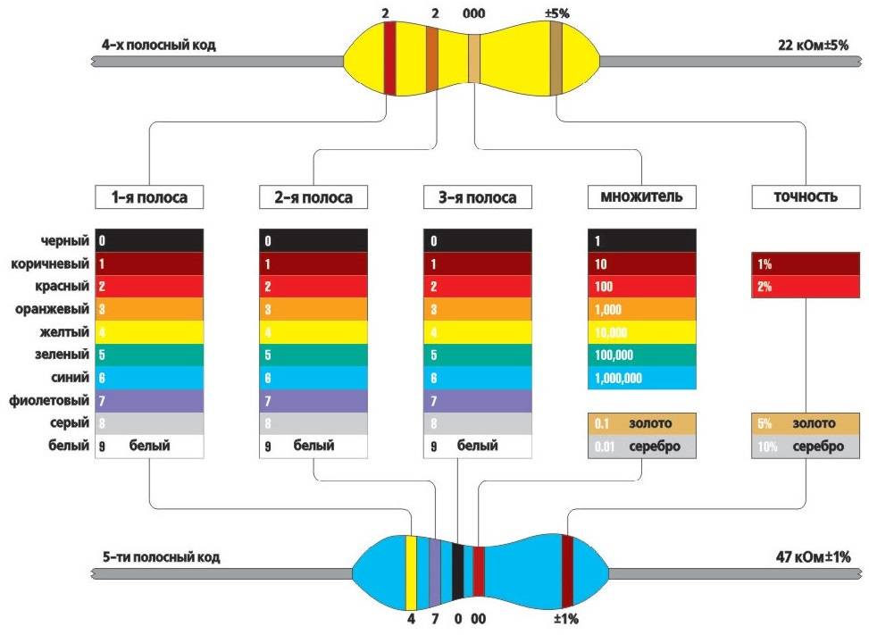 Цветовая маркировка резисторов: количество полосок и значение их местоположения