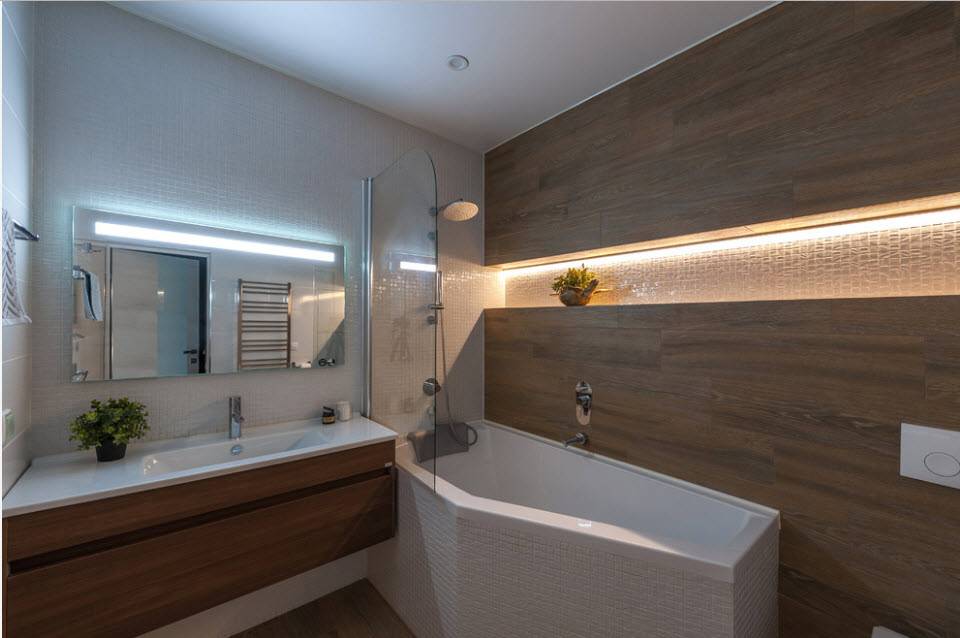 В зависимости от площади ванную комнату условно можно разделить на несколько участков, где дополнительный свет будет наиболее уместен: